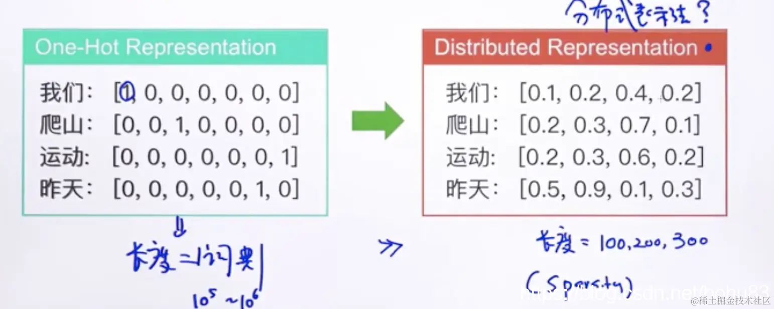 1分布式表示长度与词典长度无关,可以自定义,解决了稀疏性问题。
