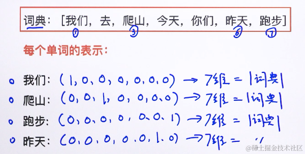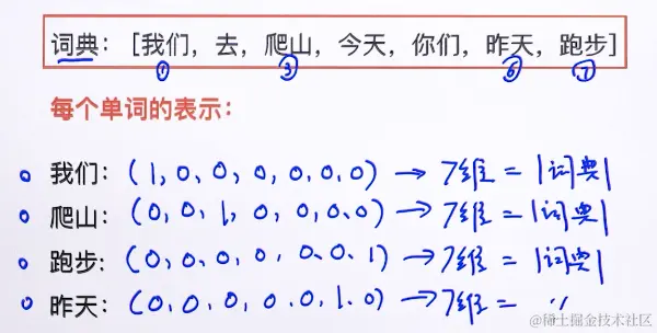 这个向量的维度是词表大小,其中绝大多数元素为 0,只有一个维度的值为 1,这个维度就代表了当前的词。
