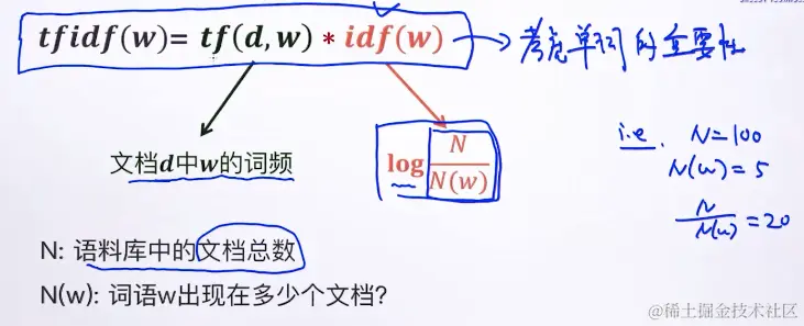 例子里面:N =总文档,N(W)出现W的单词的文章数。加log是为了结果乘积不太大。