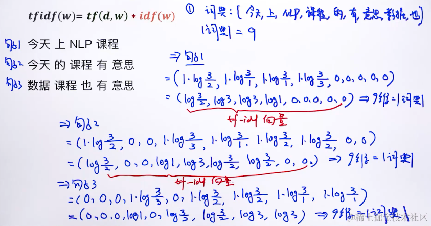 词典是9 ,是9维的,idf 里面,N=3. 分别计算3个句子的向量:就是拿词典的单词分别于句子对比,计算。