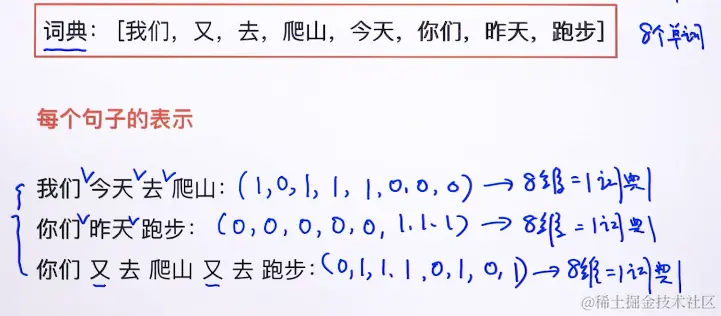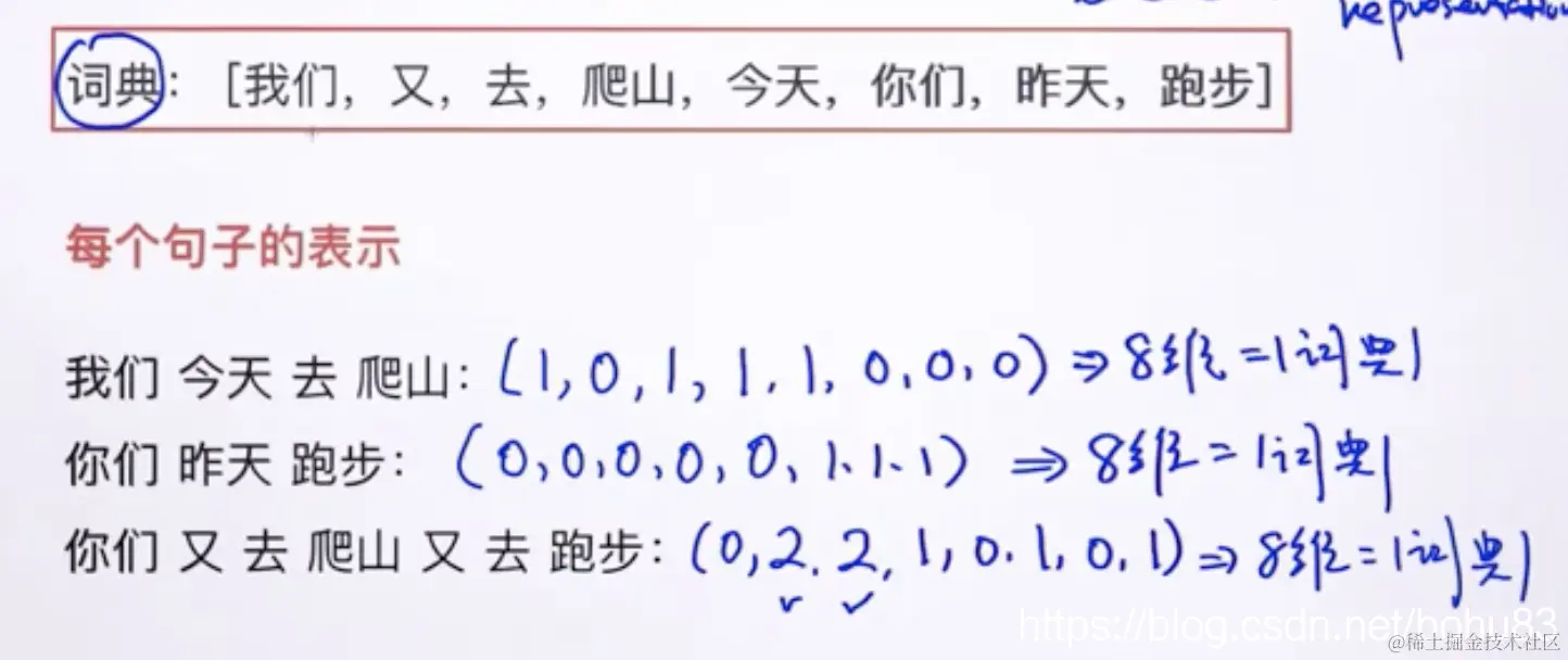 将词典看成一个一维向量,若词典里的单词在句子中出现(不管几次),则一维数组的对应位置标为1