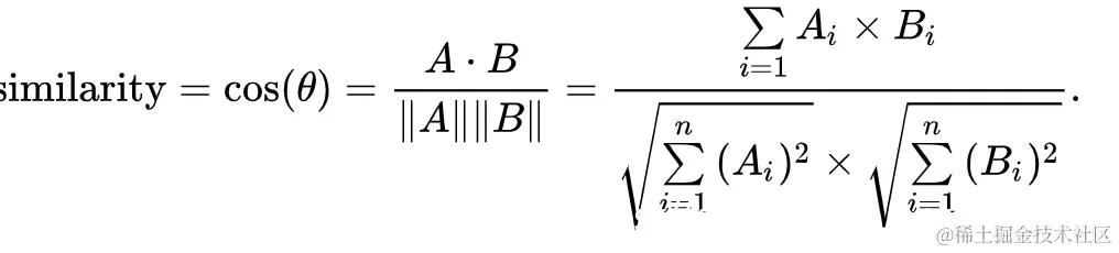 这里的分子的A,B分别代表向量A和B的各向量(内积),分母的||A|| 表示符号是范数的表示符号,可以理解而为向量的“长度”。
