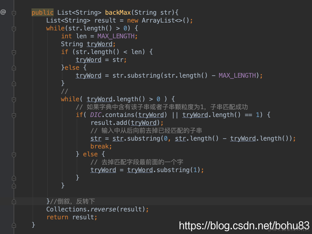 跟前向最大匹配差不多,需要注意的就是数据输出前需要反转下。或者用stack来弹出。