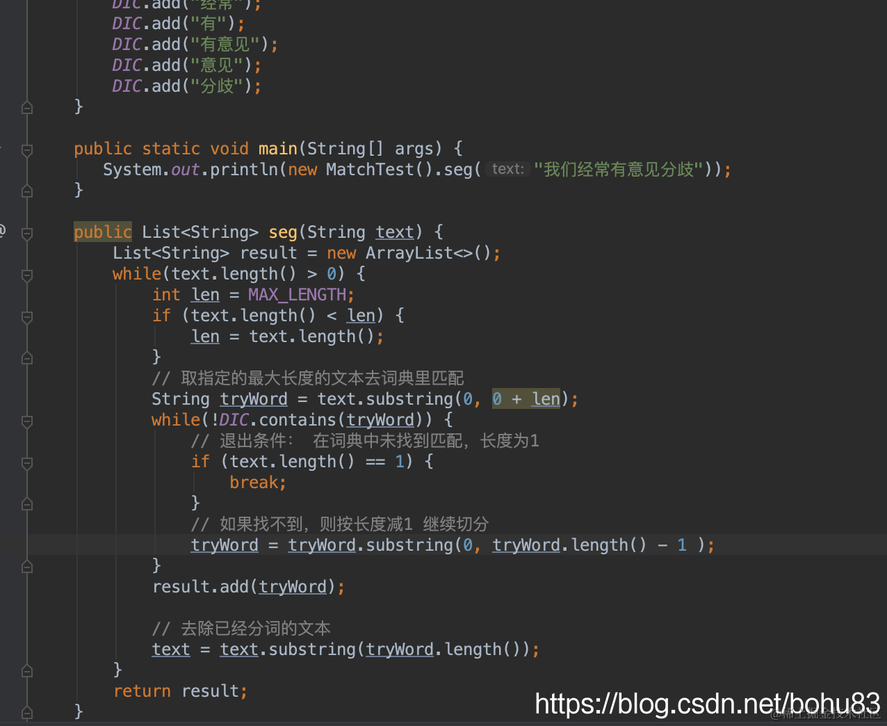 下面是Java的一个demo。maxlength我取了5.(经验值5-10,需要综合考虑:1 词典里面的那些词语,大部分情况会事多长。因为长度跟每步是线性的,所以太长影响时间复杂度)