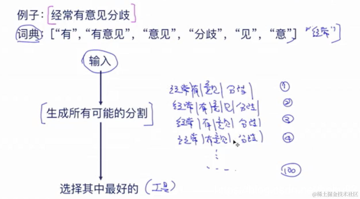 考虑语义,假设我们有个工具(通常是语言模型),根据这个工具能给出某句话分词之后的分值。那么我们可以根据词典生成所有的分词组合,