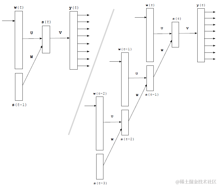 每来一个新词,就和上一个隐藏层联合计算出下一个隐藏层,隐藏层反复利用,一直保留着最新的状态。各隐藏层通过一层传统的前馈网络得到输出值。
