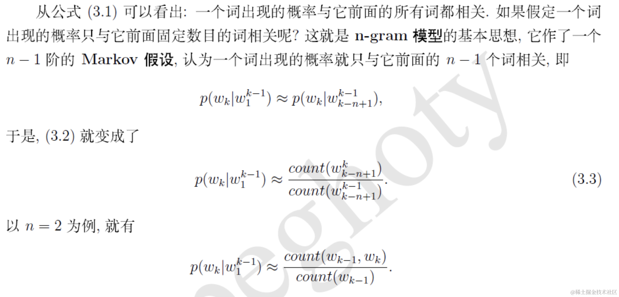 这个看着简单,但是却难以落地,因为如果直接算条件概率转化后的式子的话,对每个词要考虑它前面的所有词。数据量很大。