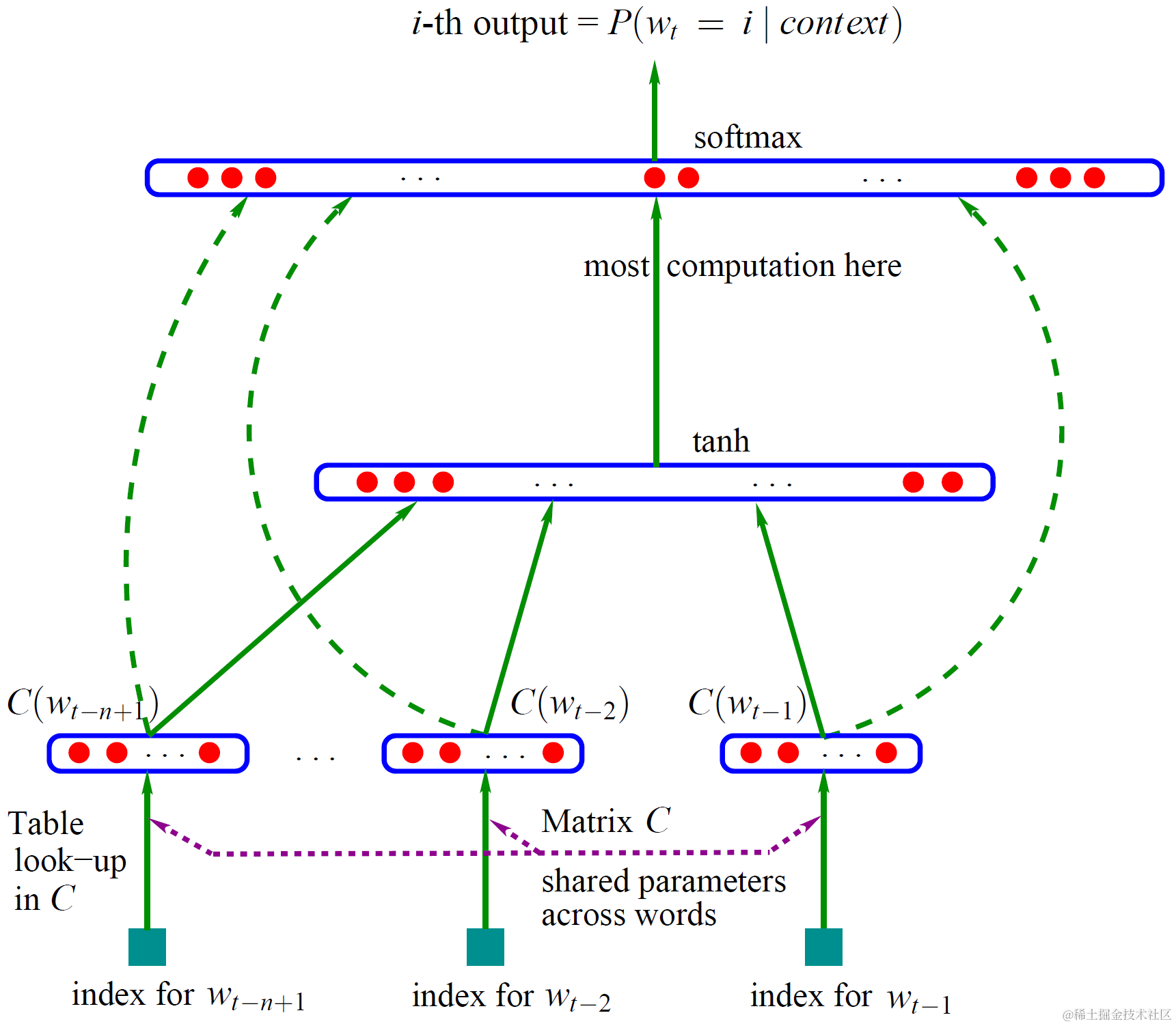 图中最下方的 wt−n+1,…,wt−2,wt−1 就是前 n−1 个词。现在需要根据这已知的 n−1 个词预测下一个词 wt。C(w) 表示词 w 所对应的词向量,整个模型中使用的是一套唯一的词向量,存在矩阵 C(一个 |V|×m 的矩阵)中。其中 |V| 表示词表的大小(语料中的总词数),m 表示词向量的维度。w 到 C(w) 的转化就是从矩阵中取出一行。