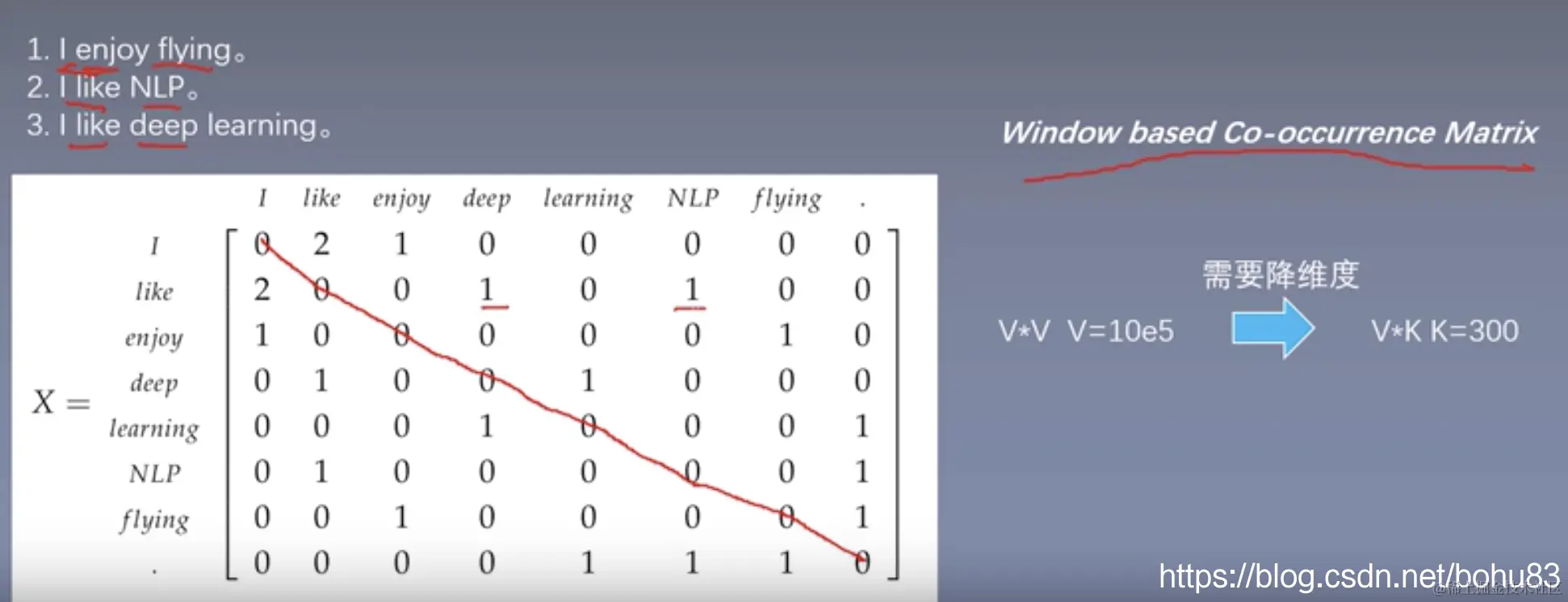 这里窗口的大小是1.举例来说,I跟enjoy,like有关,enjoy跟I,flying有关,而I跟flying无关。