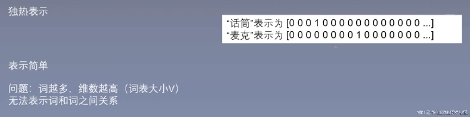 缺点:无法表示词和词之间的关系,就上面的例子无法体现出“话筒”“麦克”的相似度。