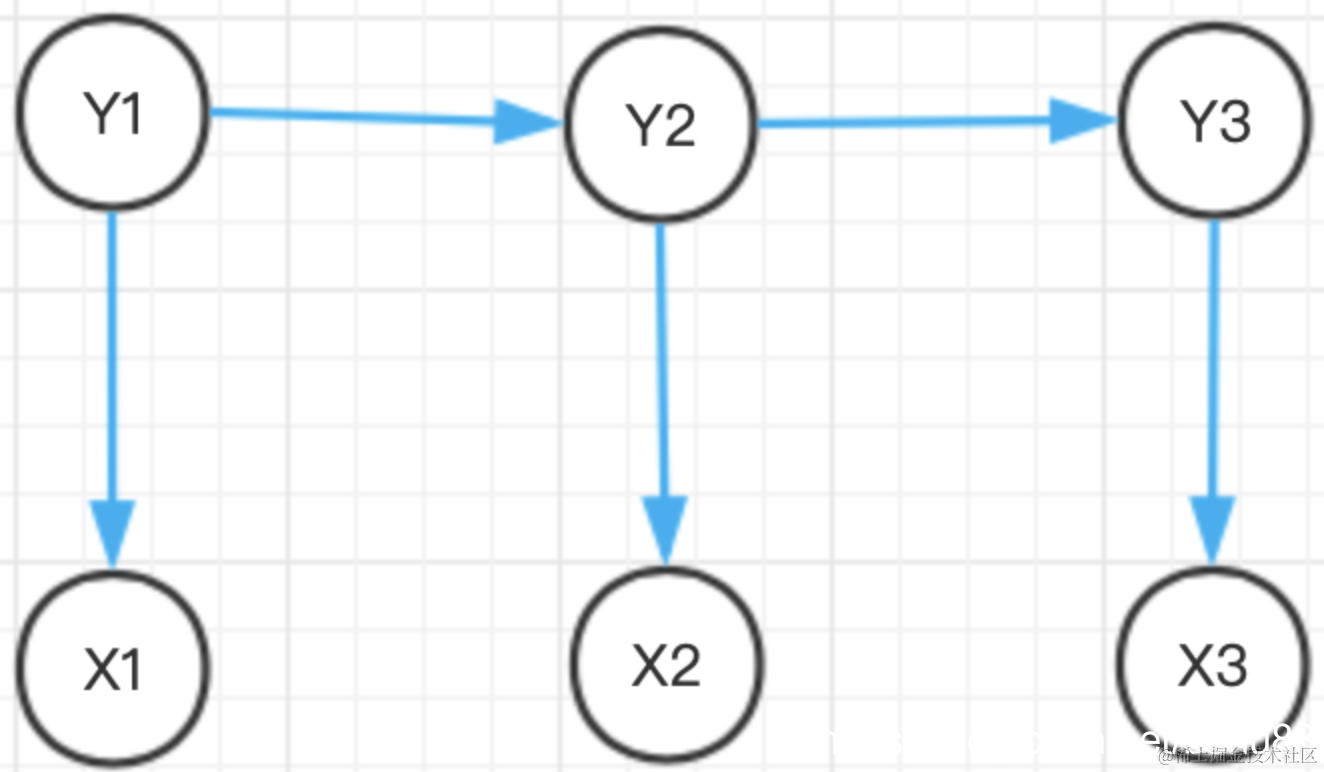 隐马尔可夫模型做了第二个假设: ② 任意时刻的观测 x 只依赖于该时刻的状态 Yt,与其他时刻的状态或观测独立无关。如果用箭头表示事件的依赖关系(箭头终点是结果,依赖于起点的因缘),则隐马尔可夫模型可以表示为下图所示