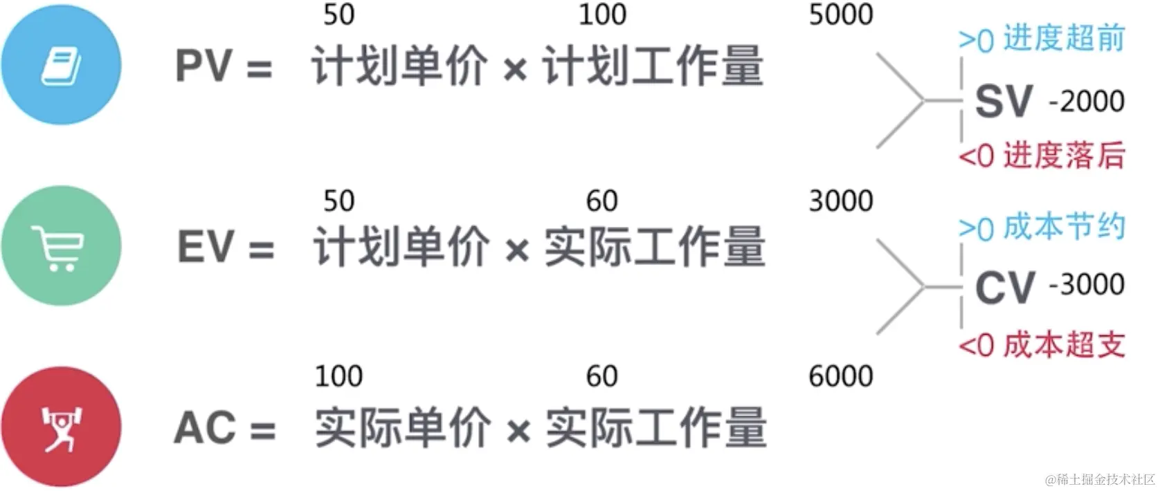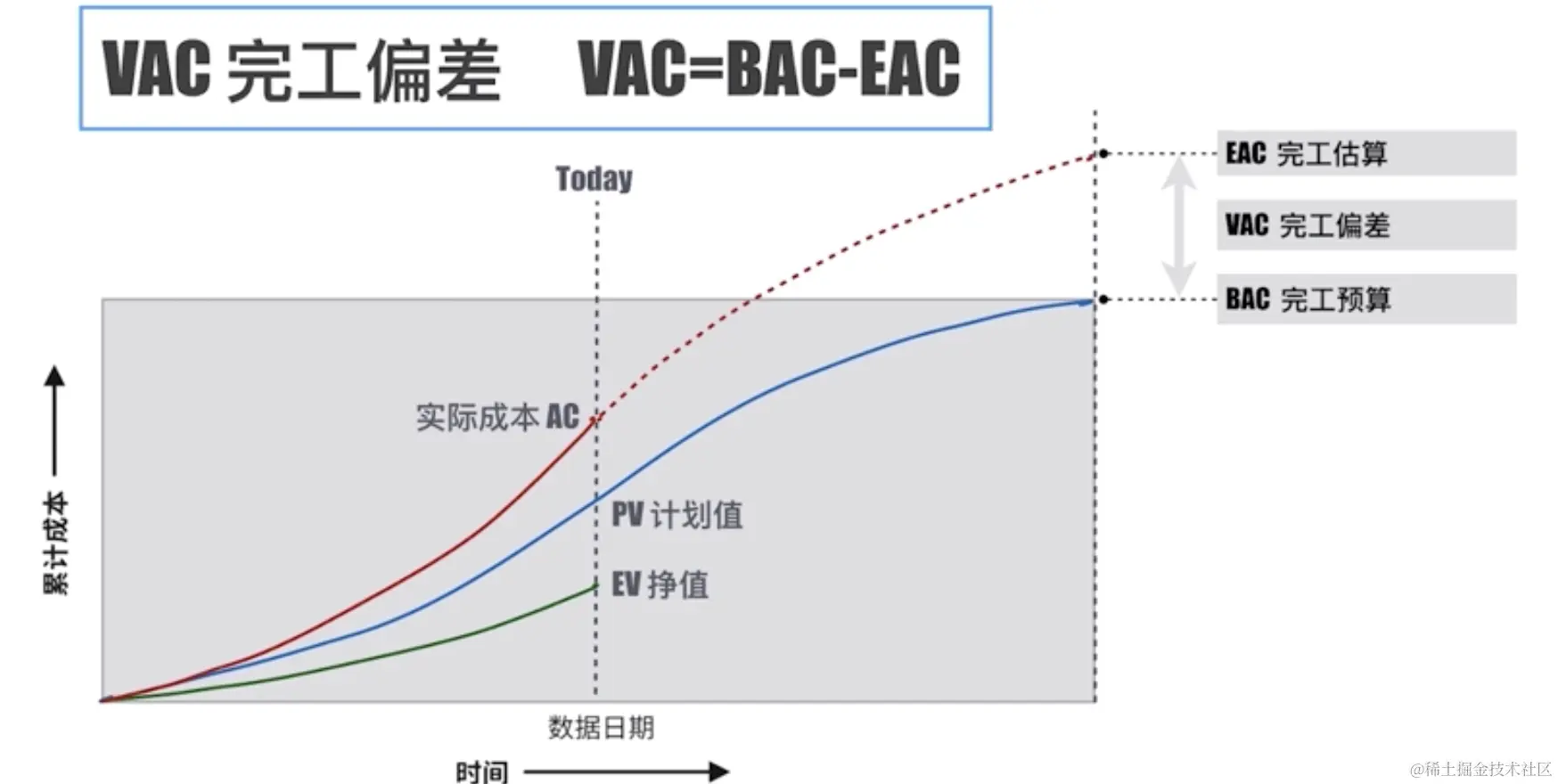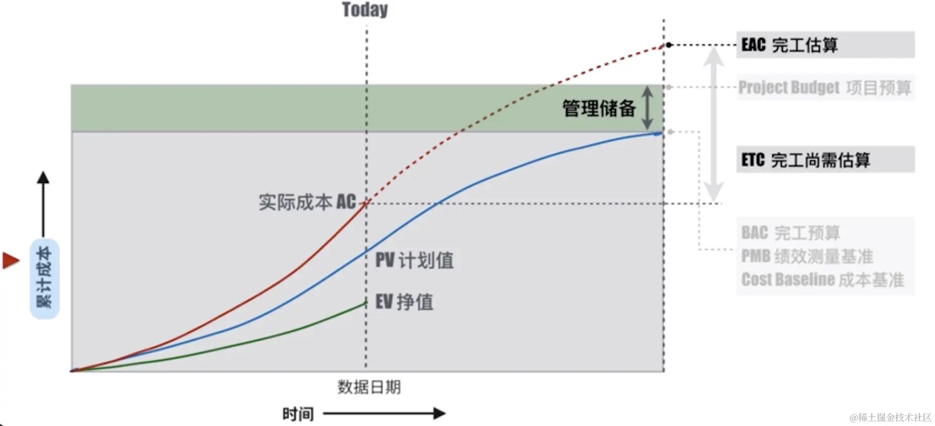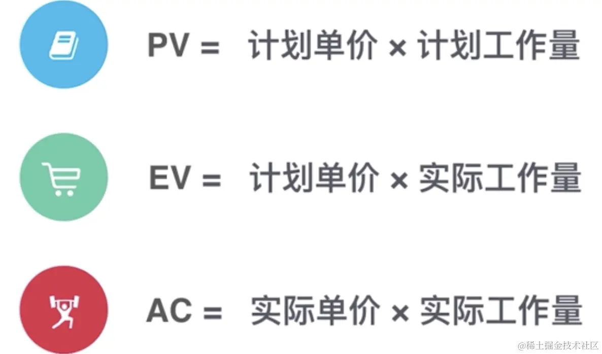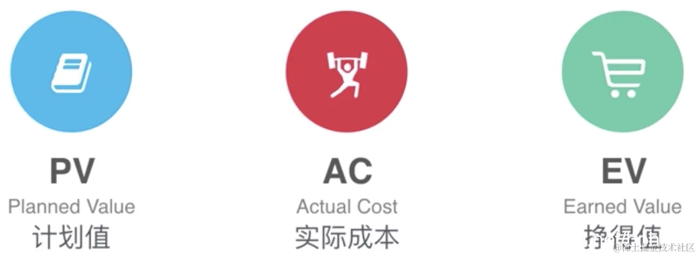 PV是计划值,AC是评估时刻的实际成本,EV是评估时刻实际完成工作的价值(被客户认可的价值)