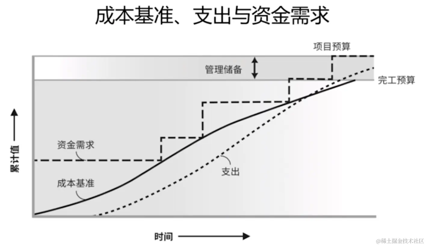 这个图从右往左看。成本基准并不包括管理储备,成本基准包含应急储备,因为已经分配到工作包甚至活动上了。