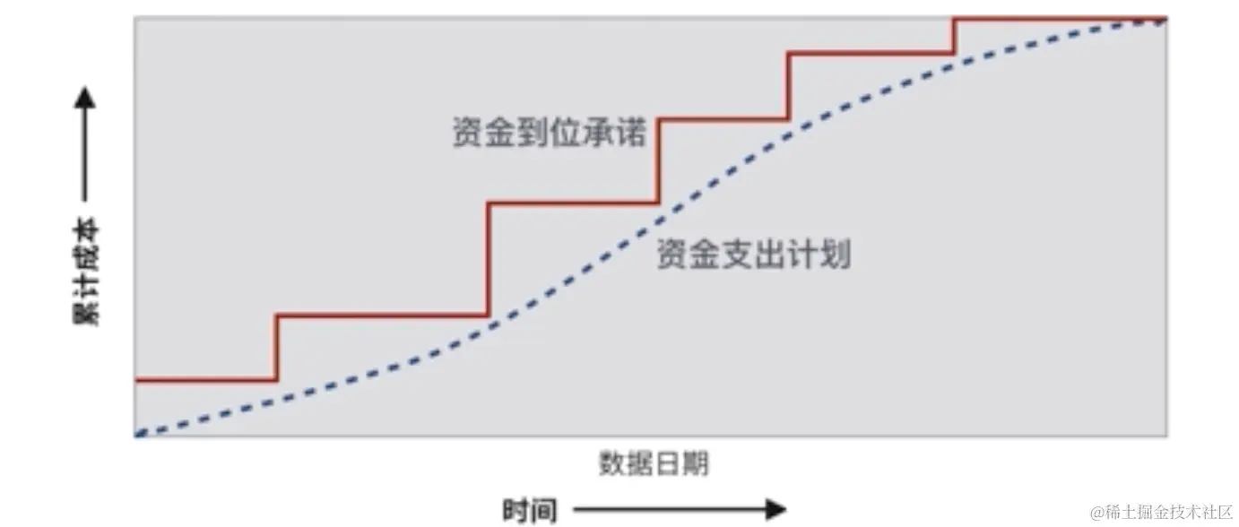 虚线是计划,实线曲线是加上了应急储备(也是成本基准),加上管理储备才是项目预算。