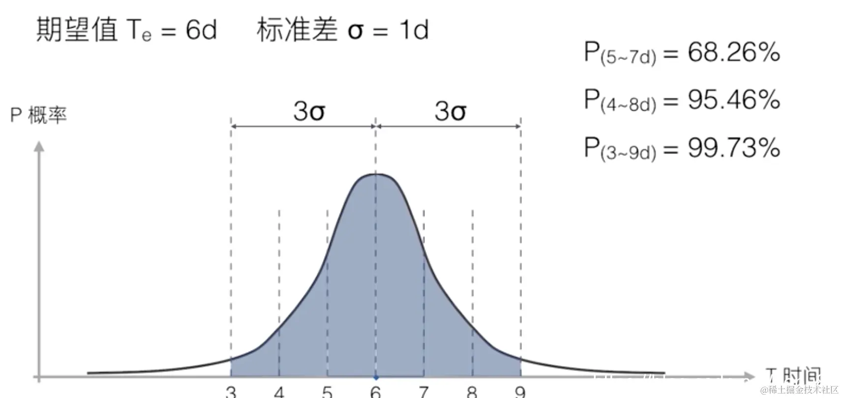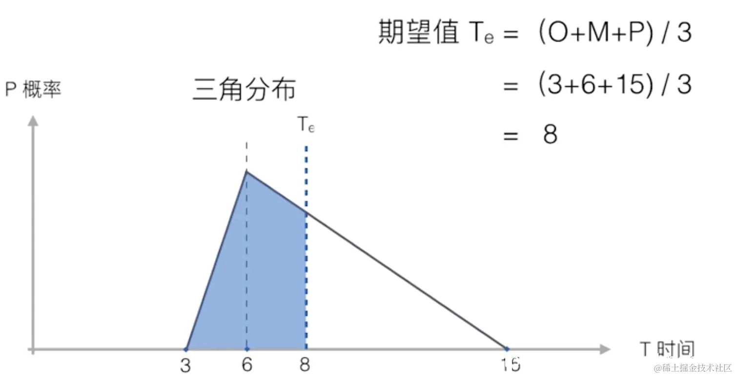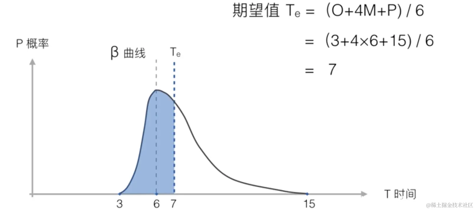 知道乐观O,最可能:M,悲观:P 三个持续时间,使用概率分布均值(期望值T)公式计算。
