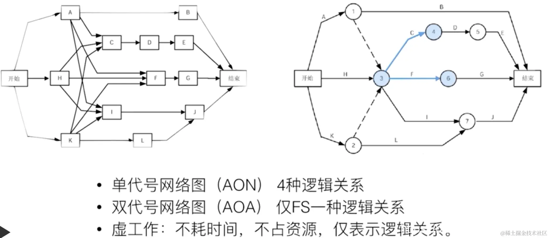 AON 4种关系包括:FS,SS,FF,SF.双代号网络图:仅有FS一种逻辑关系,其他需要依赖虚线表示。