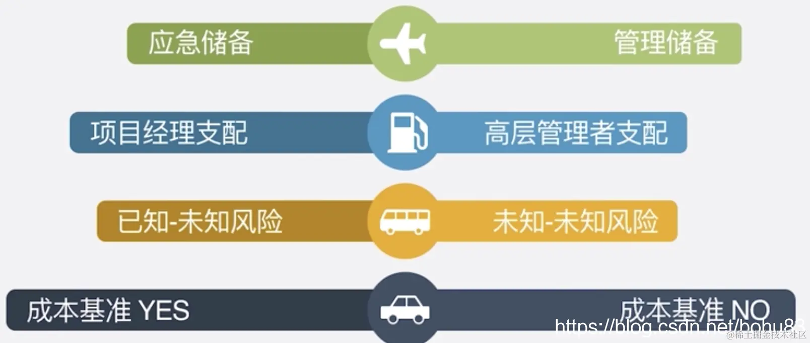储备分析:应急储备(项目经理)应对已知-未知风险,管理储备(高层管理者),应对未知-未知风险。