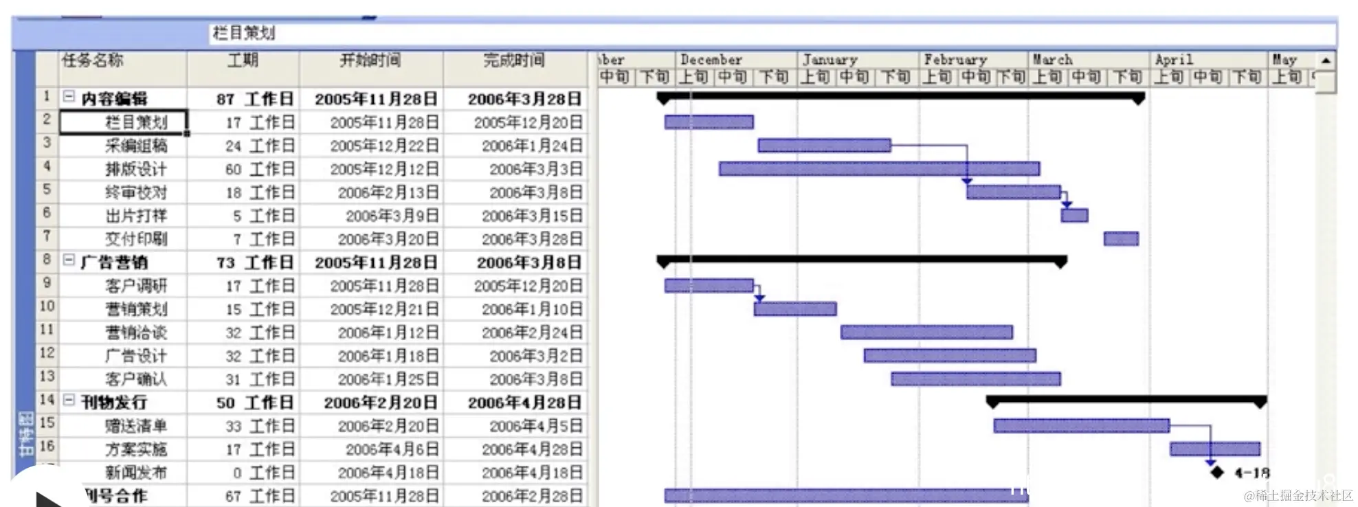 横道图的优点:直观形象,缺点:不能体现出关键路径。