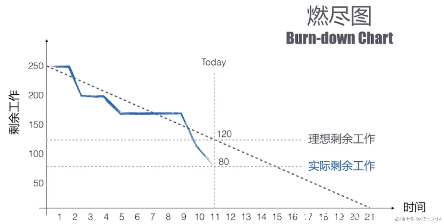 敏捷开发常用,蓝色是实际曲线,灰色是计划曲线。