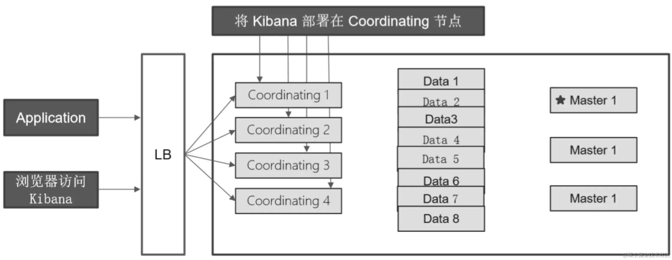 讲kibana部署在coordinating节点,实现了kibana集群的高可用。