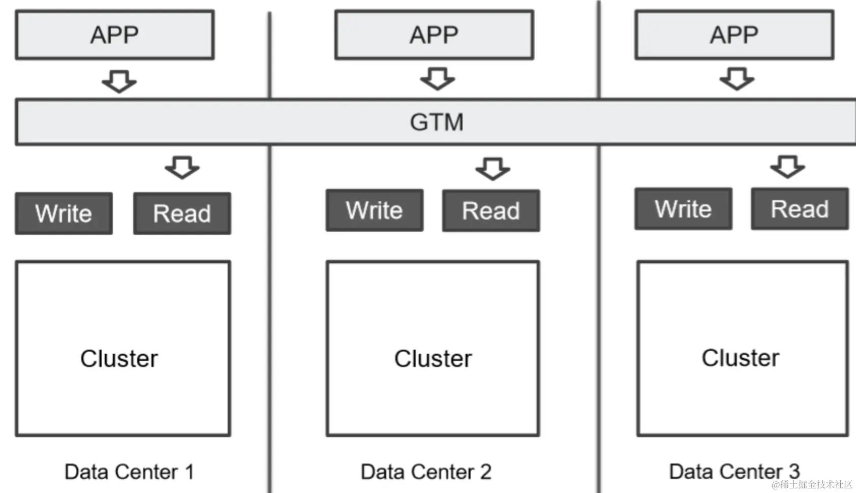 集群处在三个数据中心;数据三写;GTM 分发读请求