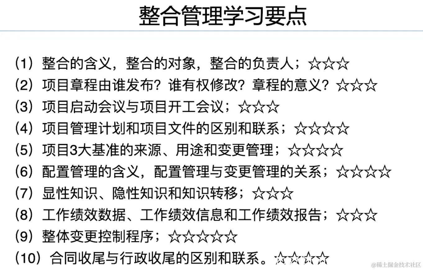 本章属于10大知识领域的第一章。也就是说前3章属于预习内容,侧重于熟悉pmbok的书格式啥样,考题会有啥样,然后大概哪些章节。从本章开始进入核心内容学习。