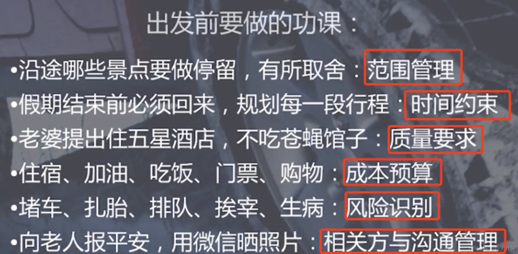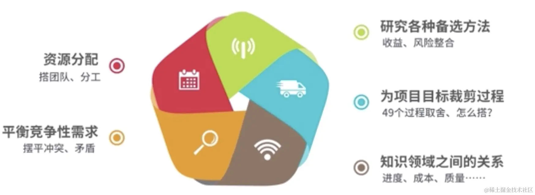 范围管理、时间约束、质量要求、成本预算、风险识别、相关方与沟通管理。