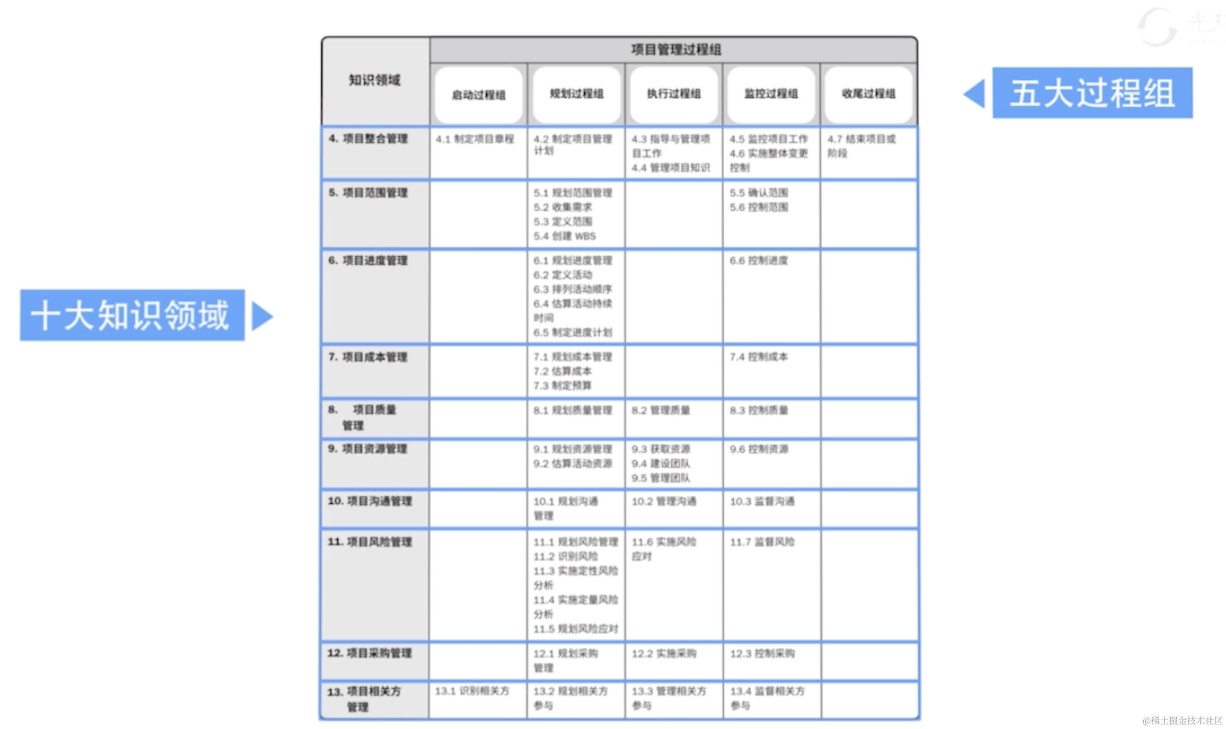 从知识维度看,10大知识领域,49个过程也可以关联到不同知识领域。
