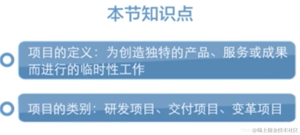 项目的定义:为创造独特的 产品 、服务、或者成果而进行的临时性工作。