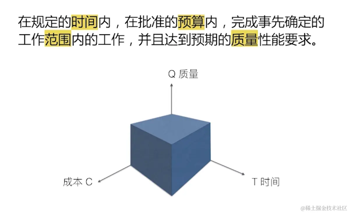 在规定的时间内,再批准的预算内,完成事先确定的工作范围内的工作,并且达到预期的质量性能要求。