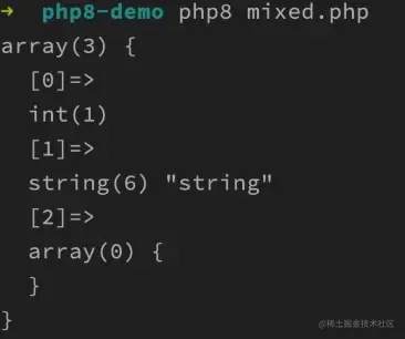 该类型等价于 array| bool| callable |int |float |null |object |resource |string,示例代码如下: