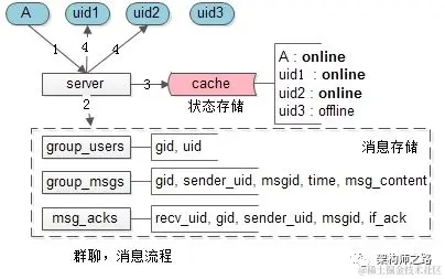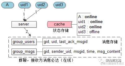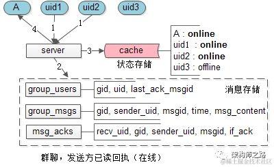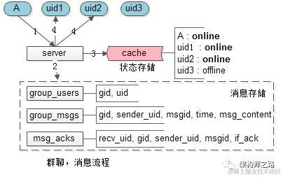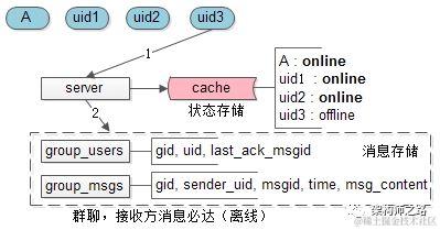 (2)server收到消息后,一来要将群消息落地,二来要查询群里有哪些群成员,以便实施推送;