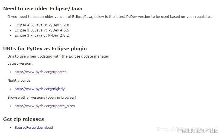 打开 www.pydev.org/ ,点击Download,可以查看到Eclipse版本与需要的PyDev版本和Java版本,需安装对应的PyDev。目前最新版PyDev需要Eclipse 4.6以上版本,Java 1.8。下面是老版本Eclipse对应的PyDev版本。
