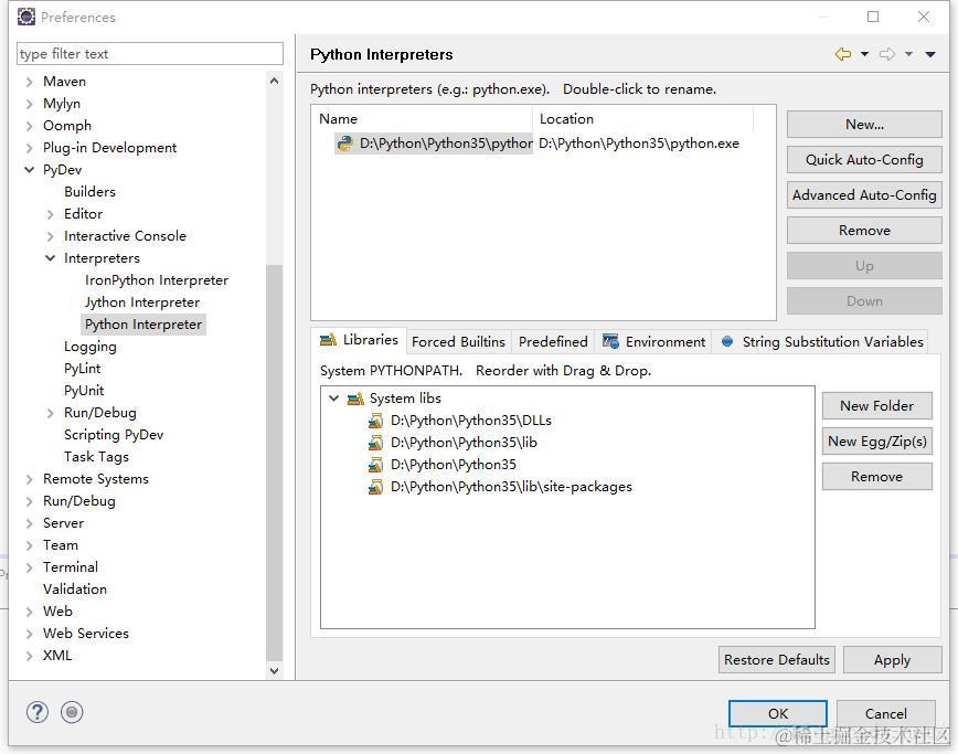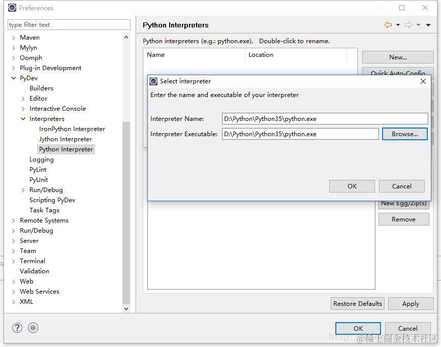 打开Eclipse后依次点击Window--Preference--PyDev--Interpreters(解释器)--Python Interprete--点击new,然后定位到Python.exe的安装路径。