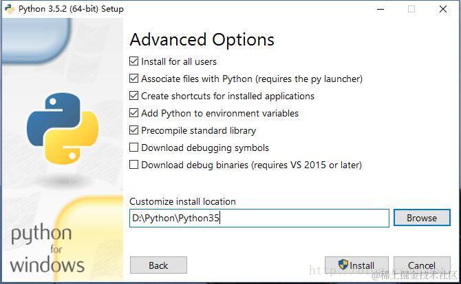 (3)先勾选Install for all users,然后自定义安装路径,比如笔者安装到D:\Python\Python35