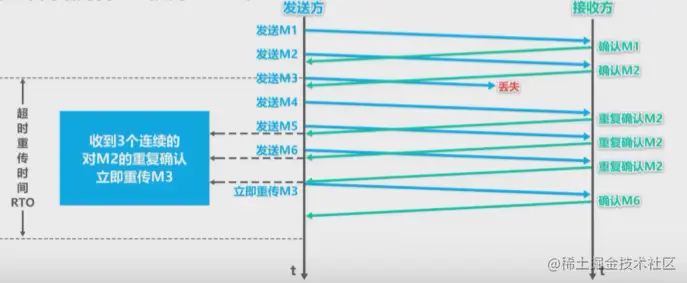重复确认。 - 发送方一旦受到了三个连续的重复确认,就将相应的报文段