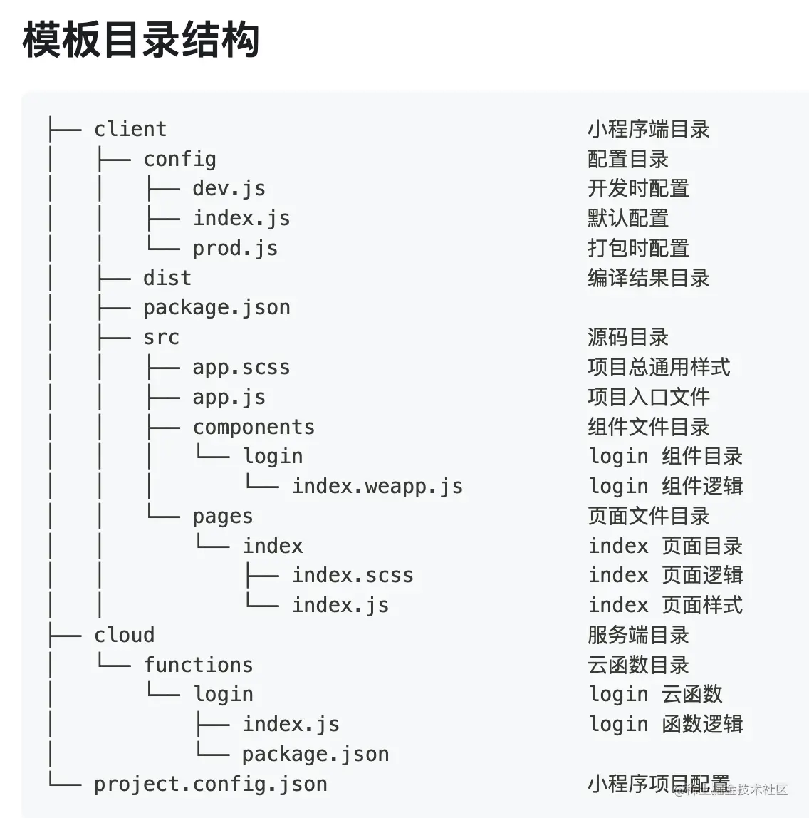 注意初始化时会让你选择模板,此处选择云开发即可,Taro 会自动生成包含云开发的示例代码,目录结构如下: