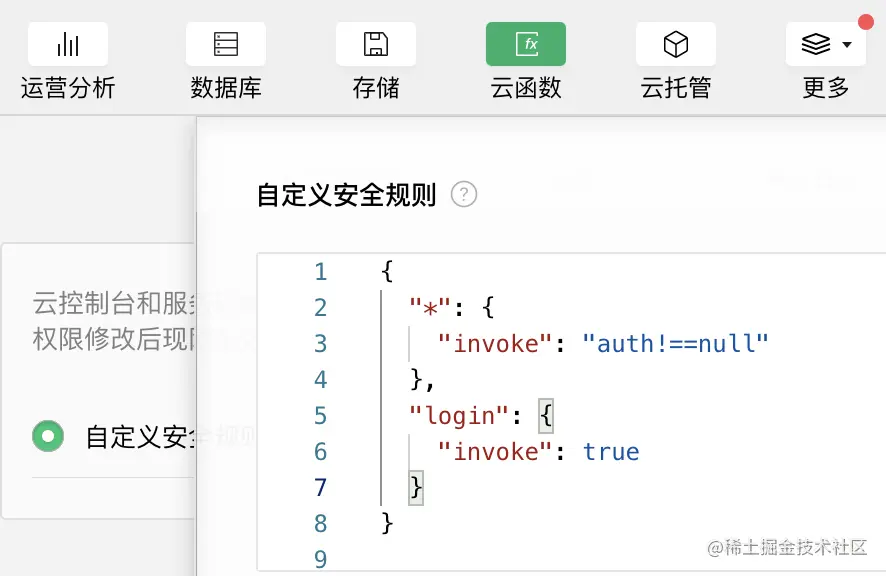 同理,也要修改云函数的安全规则,可以为不同云函数设置不同规则,比如 login 函数允许所有用户访问,而其他函数仅允许已登录用户访问: