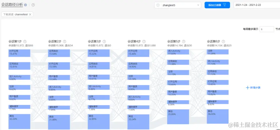 进入会话路径分析,点击过滤器添加需要查看的渠道。即可查看不同渠道用户在各个环节的转化效果。