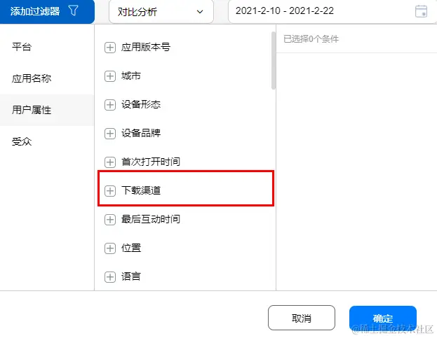 分别进入用户分析中的新增用户、活跃用户与回访用户页面,点击过滤器,筛选出不同渠道的用户,就可查看新用户、活跃用户、回访用户中哪些渠道占比最多,同时使用对比分析功能,还可判断各个渠道用户质量的差异。