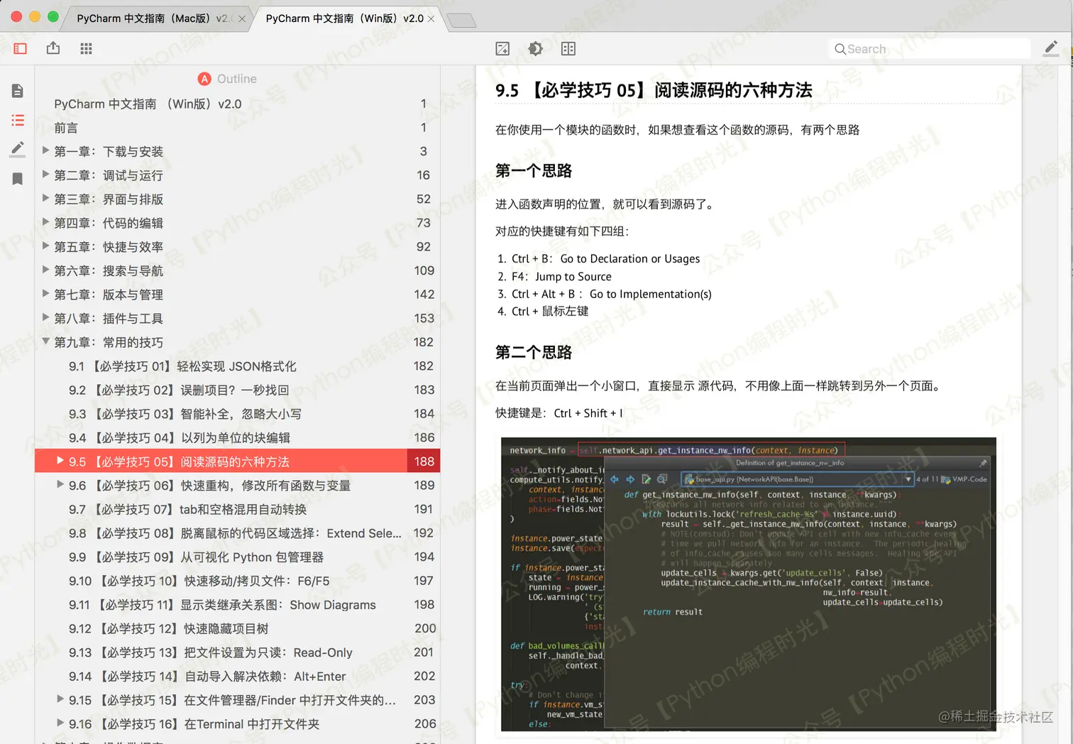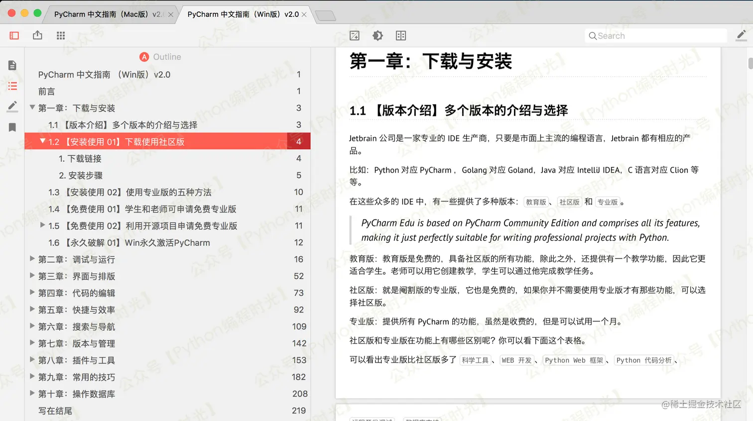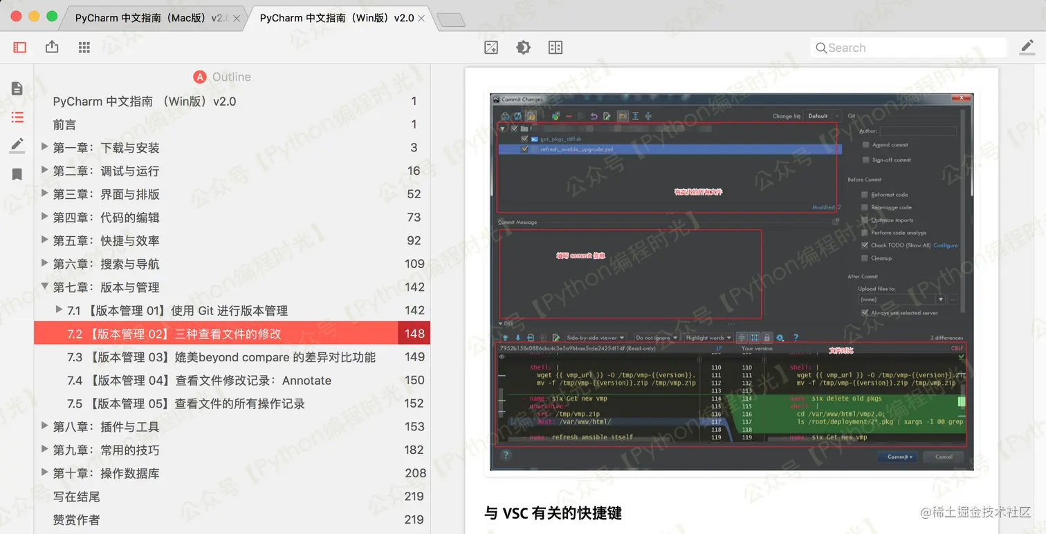 文档中的快捷键已经全部适配各自的系统,但是截图及 GIF ,出于工作量的考虑,没有再重新录制,并且我认为重新截图和录制 GIF 不是很有必要,同一版本的 PyCharm 的 Mac 和 Windows 界面的可以说差异不大,不会影响你学习该文档。