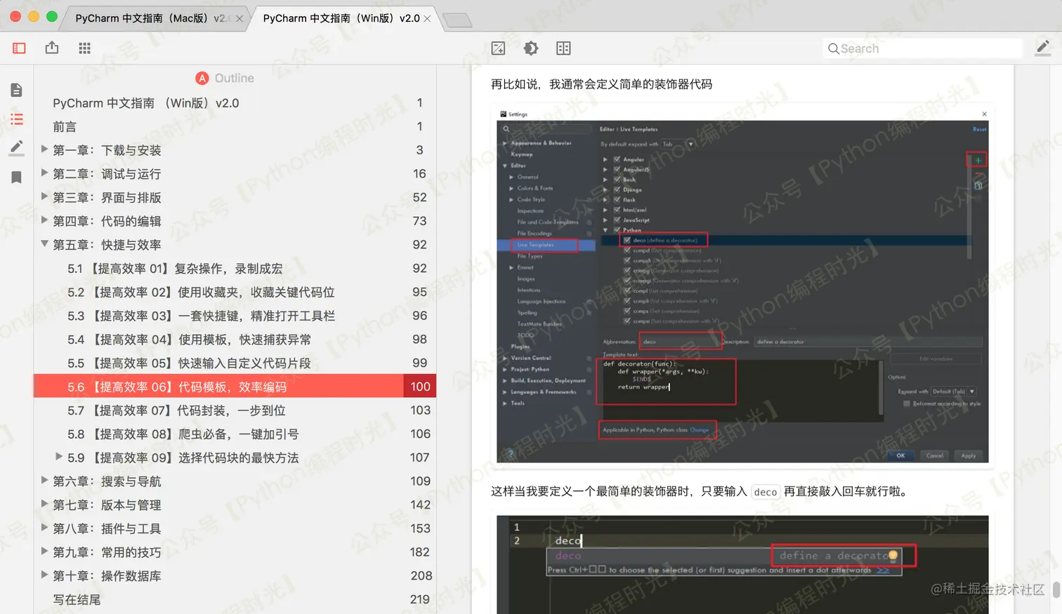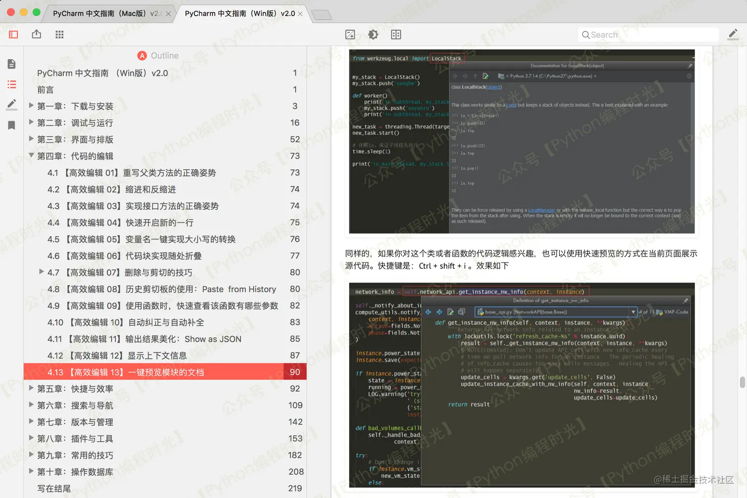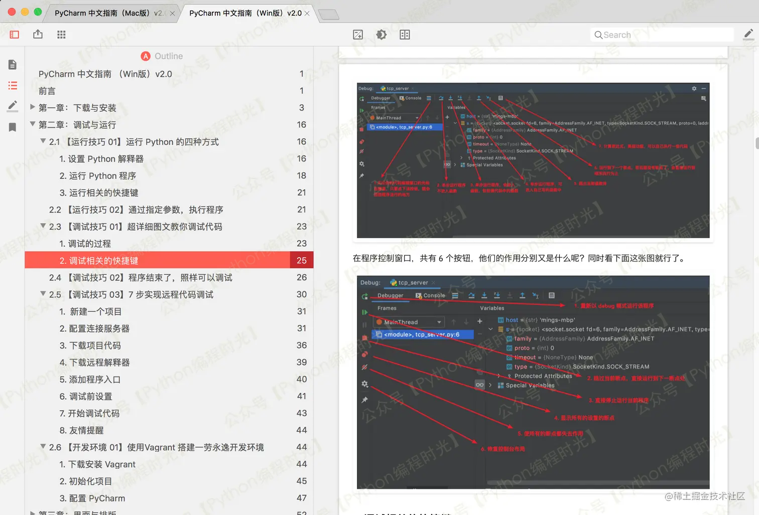 文档中的快捷键已经全部适配各自的系统,但是截图及 GIF ,出于工作量的考虑,没有再重新录制,并且我认为重新截图和录制 GIF 不是很有必要,同一版本的 PyCharm 的 Mac 和 Windows 界面的可以说差异不大,不会影响你学习该文档。