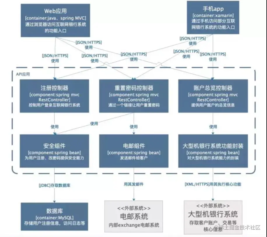上图中,除了用户和外围系统,要建设的系统包括一个基于Java Spring MVC 的 Web 应用提供系统的功能入口,基于xamarin架构的手机 app 提供手机端的功能入口,一个基于 Java 的 API 应用提供服务,一个 MySQL 数据库用于存储,各个应用之间的交互都在箭头线上写明了。