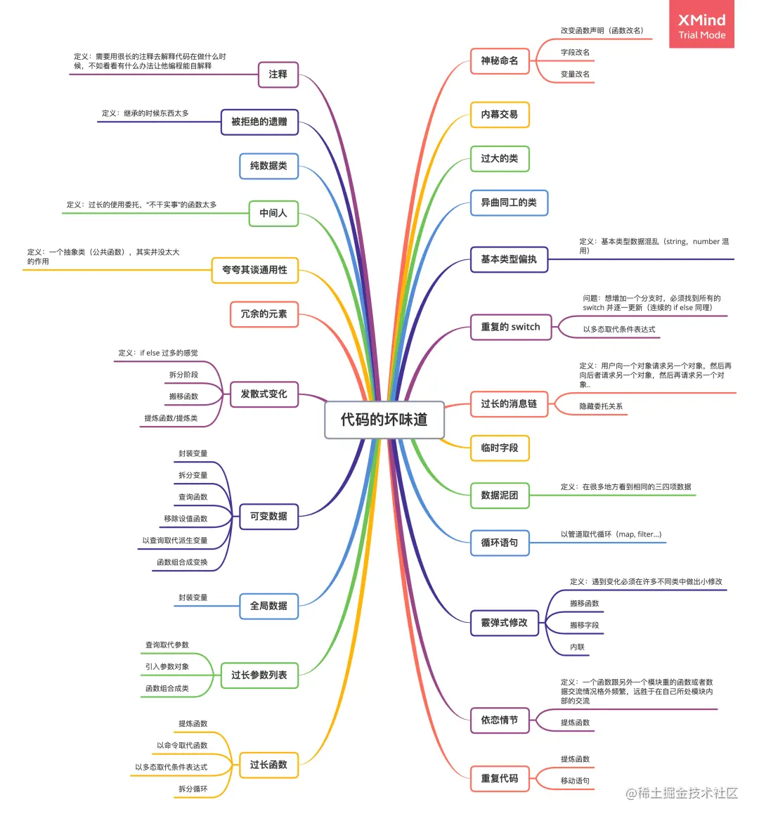 第三章 - 代码的坏味道:通常我们说重构的时候都会伴随着吐槽代码写得不好,那什么是不好的代码呢?我们平时开发的时候应该怎么避免。该书归纳出了 24 条场景供大家参考: