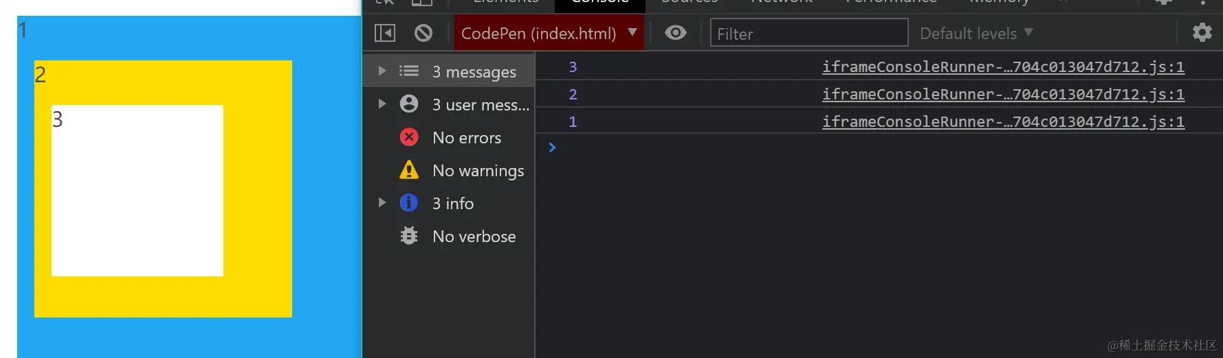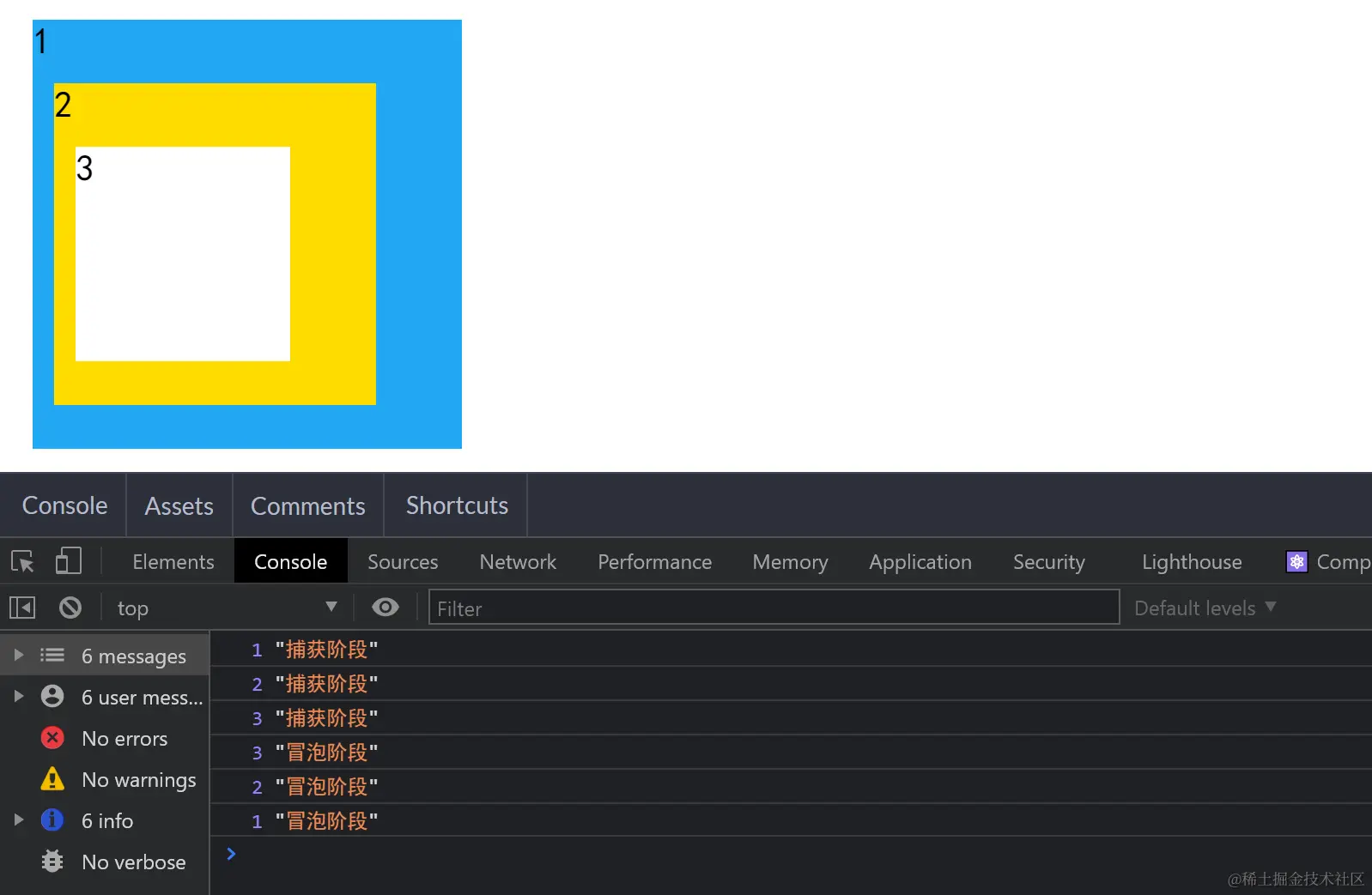点击内部的3号盒子,符合我们的预期,先执行捕获这个元素,然后执行目标元素的方法,然后冒泡出去!