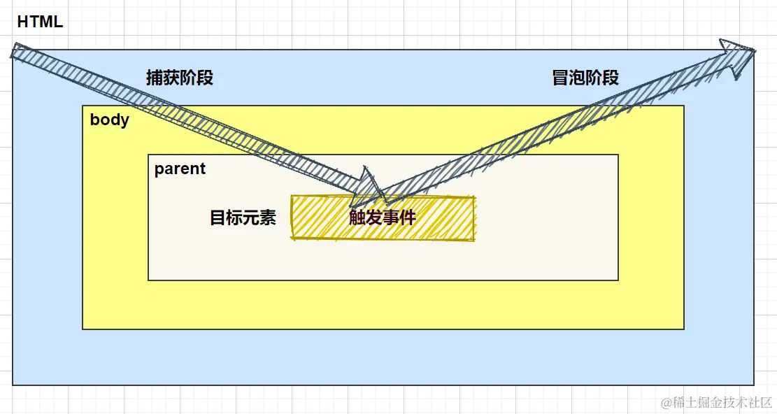 当点击时,先经过捕获阶段,从最外层如html(这里不考虑兼容了)层层找到目标。