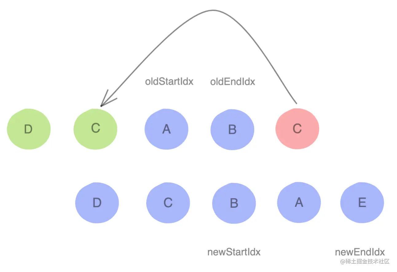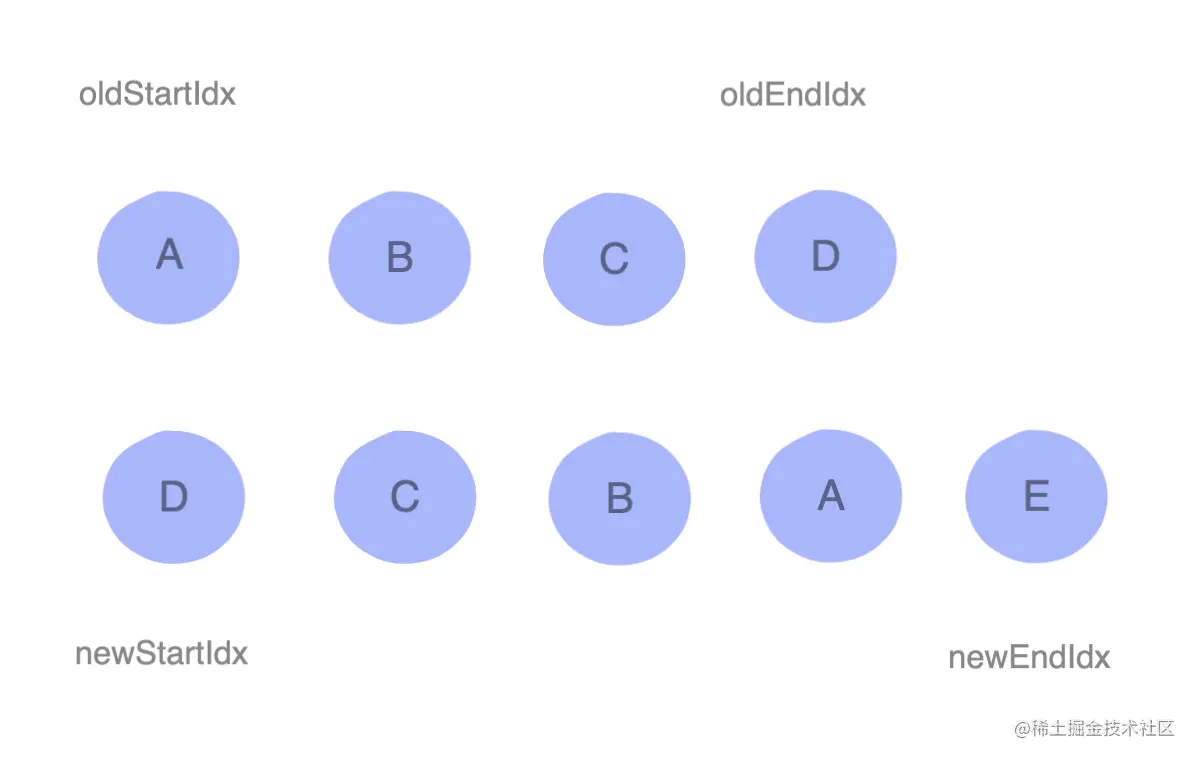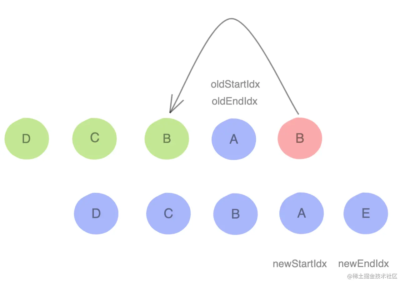while循环就不满足了,因为oldStartIdx大于了oldEndIdx,所以循环结束,执行下面的逻辑,最终形成: D C B A E。if (oldStartIdx > oldEndIdx) { refElm = isUndef(newCh[newEndIdx + 1]) ? null : newCh[newEndIdx + 1].elm addVnodes(parentElm, refElm, newCh, newStartIdx, newEndIdx, insertedVnodeQueue) } else if (newStartIdx > newEndIdx) { removeVnodes(parentElm, oldCh, oldStartIdx, oldEndIdx) }找到参考节点,把剩下的节点(