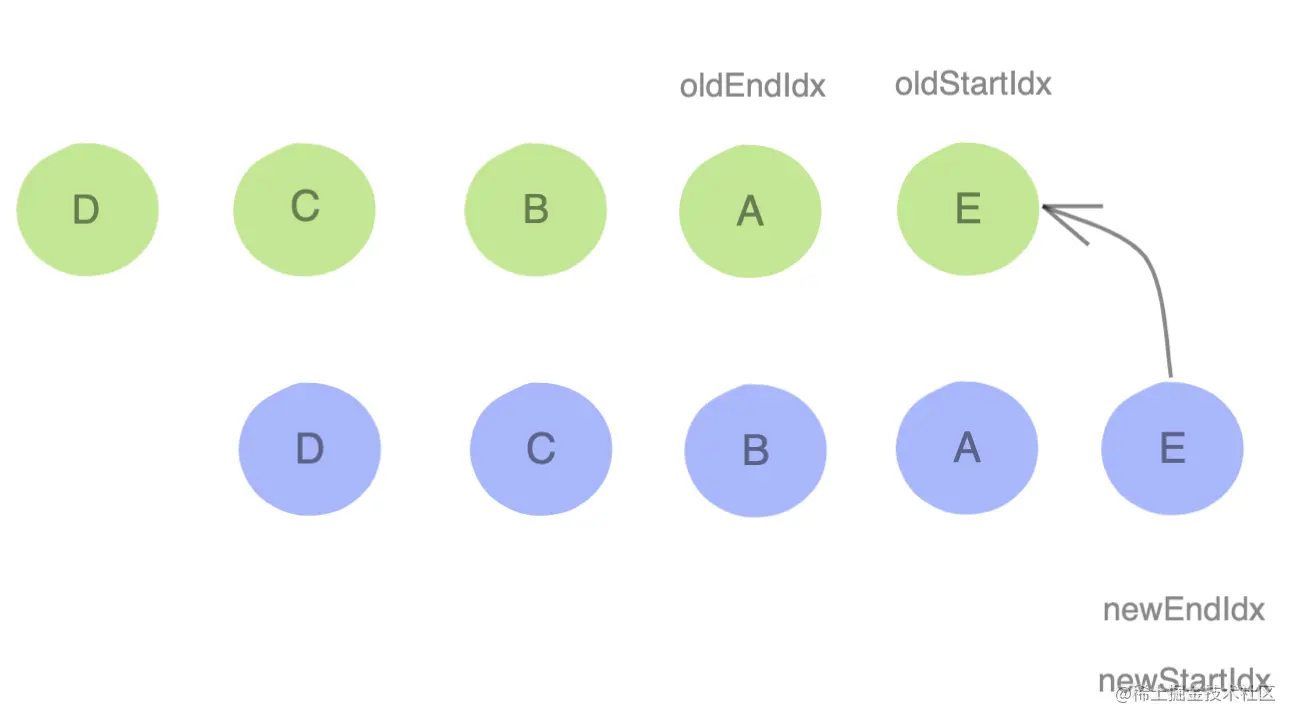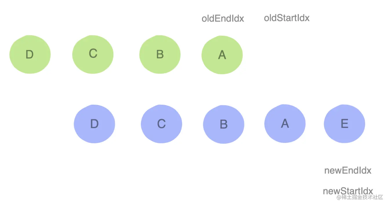 newStartIdx到newEndIdx之间的节点)通过addVnodes插入进去,图例上也就是 E。(另一个判断,如果遍历结束之后,还有新的开始节点大于新的结束节点,也就意味着旧的比新的长,就删除旧的多余的)