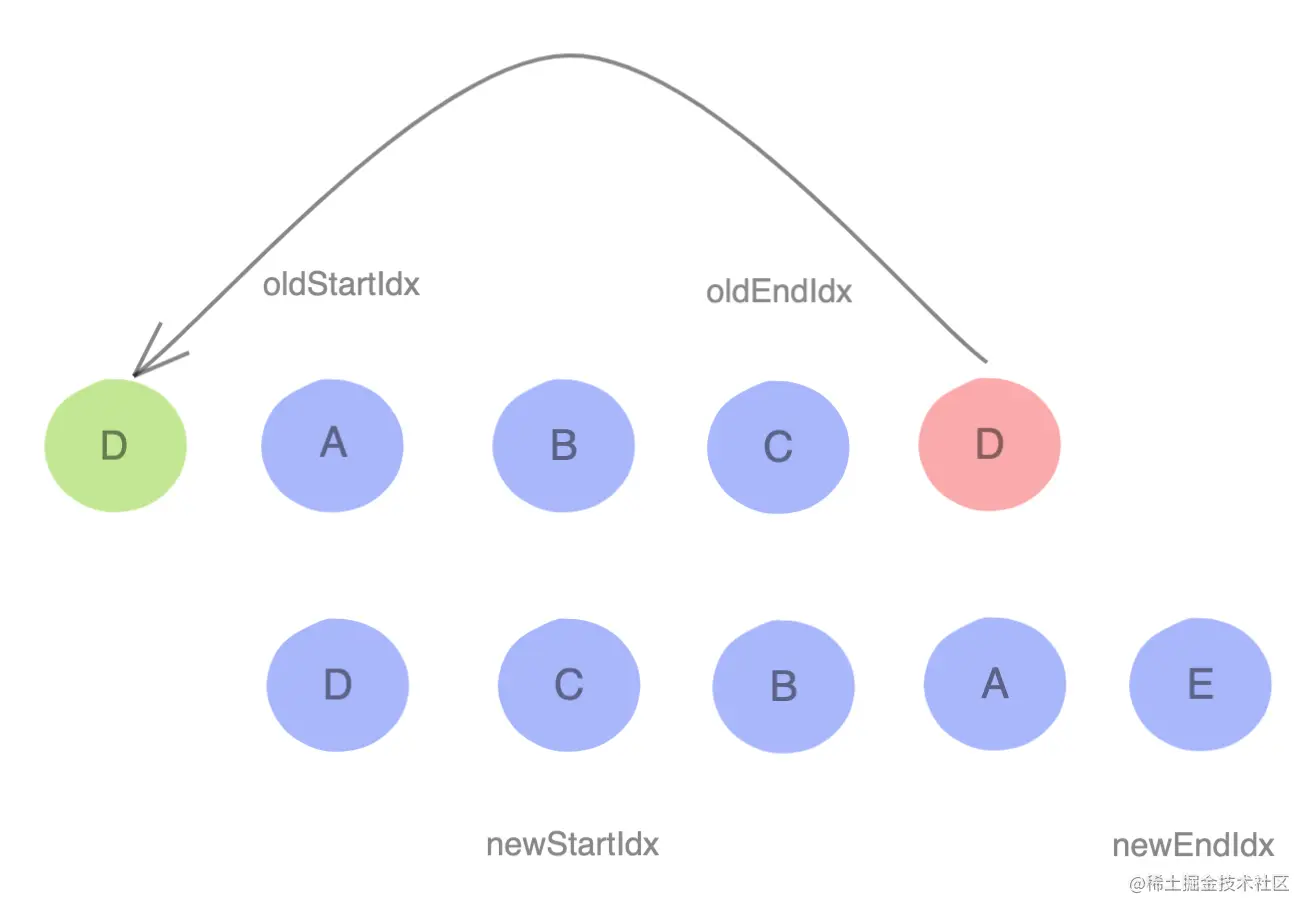 sameVnode(oldEndVnode, newStartVnode),此时和第一步一样,继续旧的末尾下标自减一个,新的开头下标自增一个,就变成了:D C B A。 -