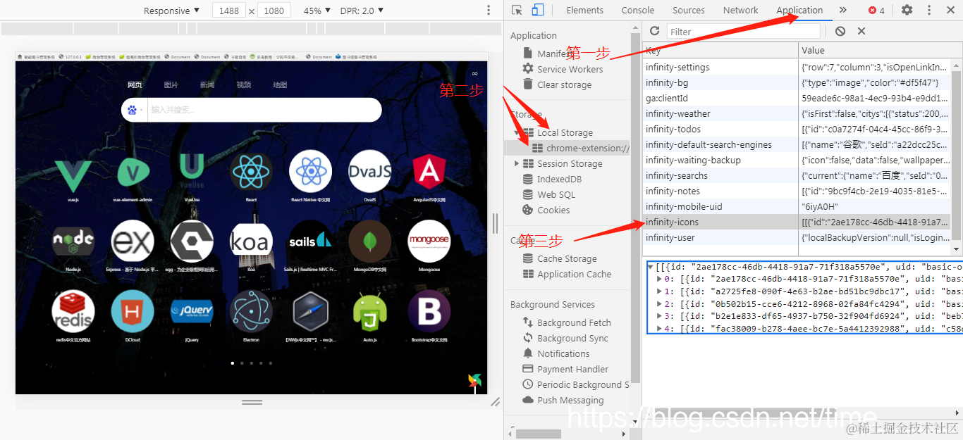然而新版的infinity pro标签不支持备份成本地infinity文件,只能通过云端进行云更新和备份,作为web前端开发者当然是要打开F12一探究竟,于是我发现,断网的状态下,刷新页面不会请求数据渲染,也就是所有的书签都存在本地缓存中,于是我试了试查看localstorage,果然查到了一个infinity-icons的键值对,这里就是infinity_pro的所有图标,如果需要复制别人的或者复制给别人,直接用此方法生成json文件或者直接用txt即可。